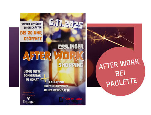 Beim AFTER WORK-Event in Esslingen haben viele Geschäfte bis 20 Uhr geöffnet. Wir sind natürlich dabei und begrüßen Euch mit einem Glas Sekt, Kaltgetränken und Snacks. Für einen Schnappschuss winkt der Fotorabatt.